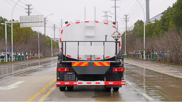 ★改装配置:罐体用4MM碳钢板制作,罐内隔板具有防波作用,以减低汽车行驶时罐体液体的冲击。整车带一个专用洒水泵(垂直最大吸程6米),洒水宽度14米,射程28米。多功能洒水车配备2个前冲(喷)(能将路面泥巴、尘土、垃圾冲干净);2个后洒(能均匀地将水洒在路面,一次洒水宽度14米)、2个侧喷(花洒)(能均匀地将路旁绿化带浇灌)、带1个后工作平台,平台上安装1个绿化洒水高炮(洒水炮可全方位旋转,可连续调成直冲状、大雨、小雨、毛毛雨,雾状可调节冲洗高大树木),引水时间<5min,流量90m3/h。带1个消防接头,带1个自流阀,1个过滤装置、人性化爬梯及侧防护栏,安装洒水音乐喇叭。