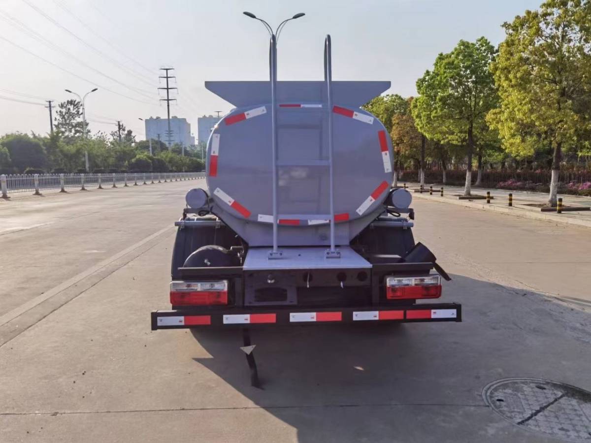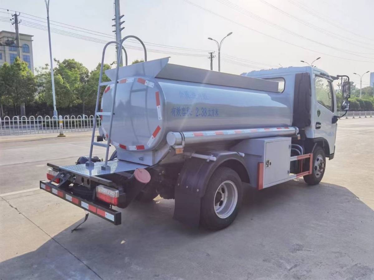 (1)底盘配置:采用国六东风多利卡底盘,轴距2950,全柴132马力,650钢丝胎,原厂空调,电动玻璃,中控锁。 (2)上装配置:严格按照公告尺寸外观样式制作,方圆罐,公告有效容积2.38方,罐体厚度采用3.5MM优质碳钢板制作,一个欧标罐口,一个海底阀,后面带紧急切断阀,驾驶室按开关,水压封头,围边内铺防滑网,带自吸自排60-30泵,泵箱装右边,预留大流量供液设备及卷盘位置在左侧,两根输油管,带牌照灯座,铁炮筒,两个灭火器,其余厂内标配。