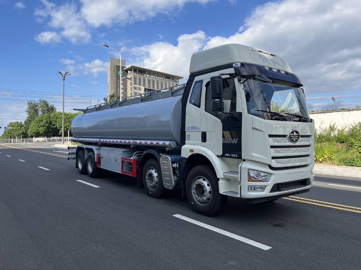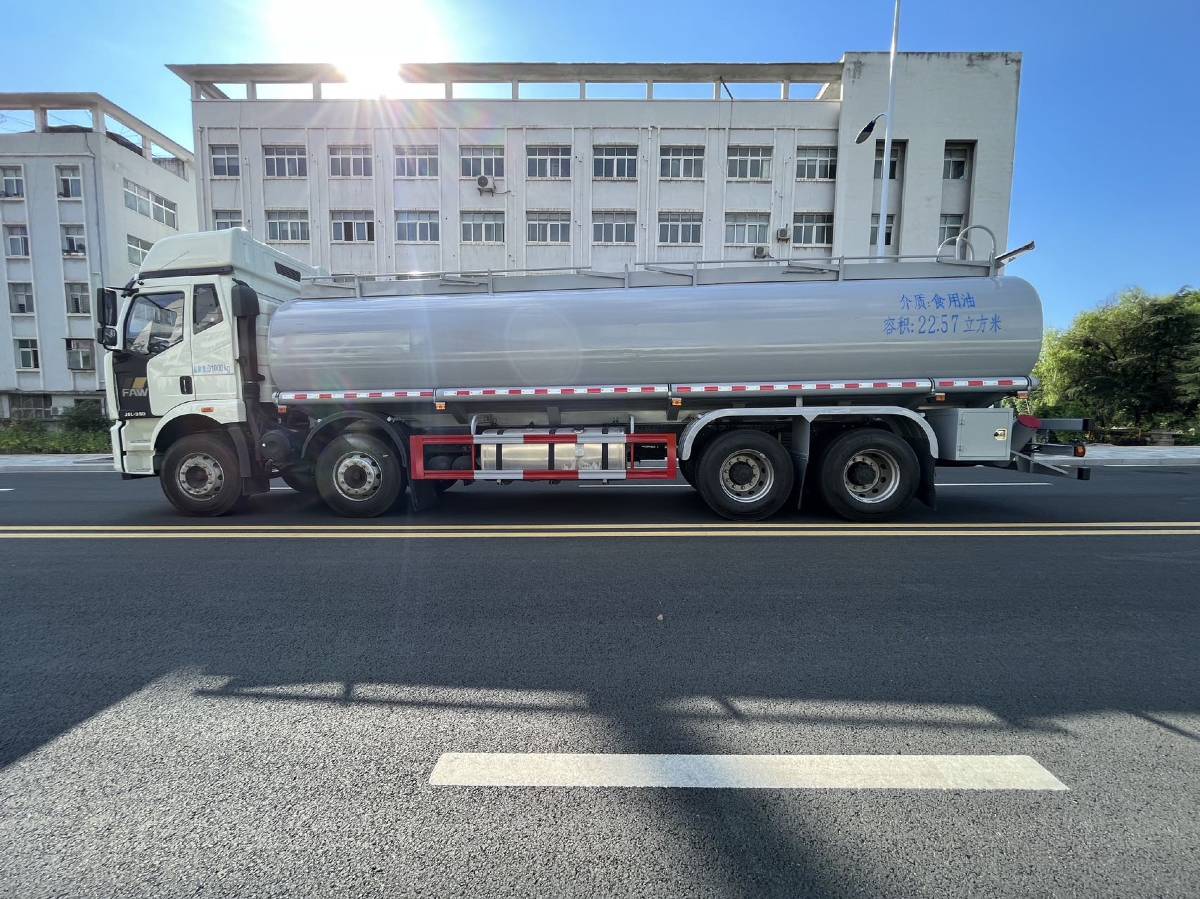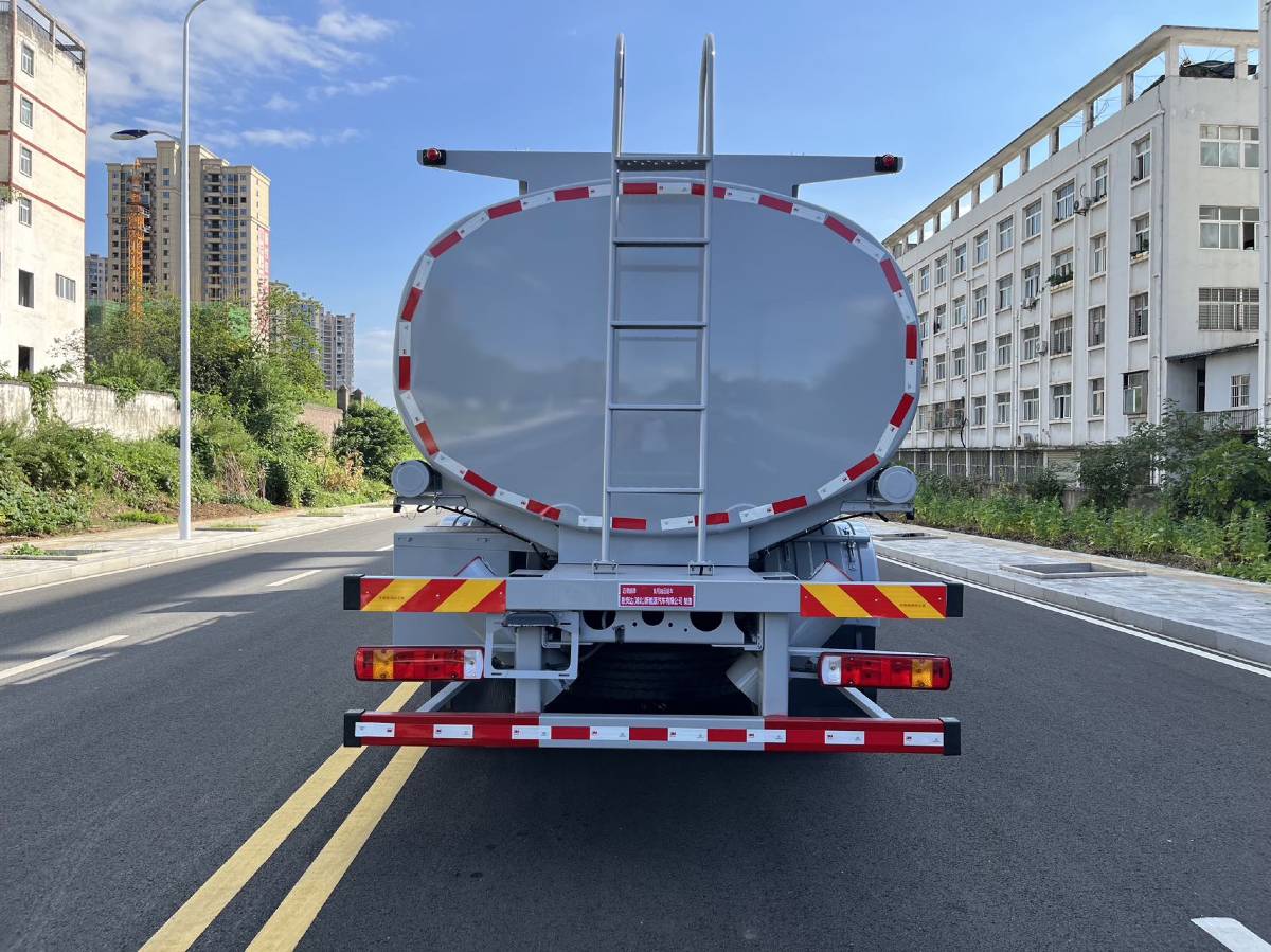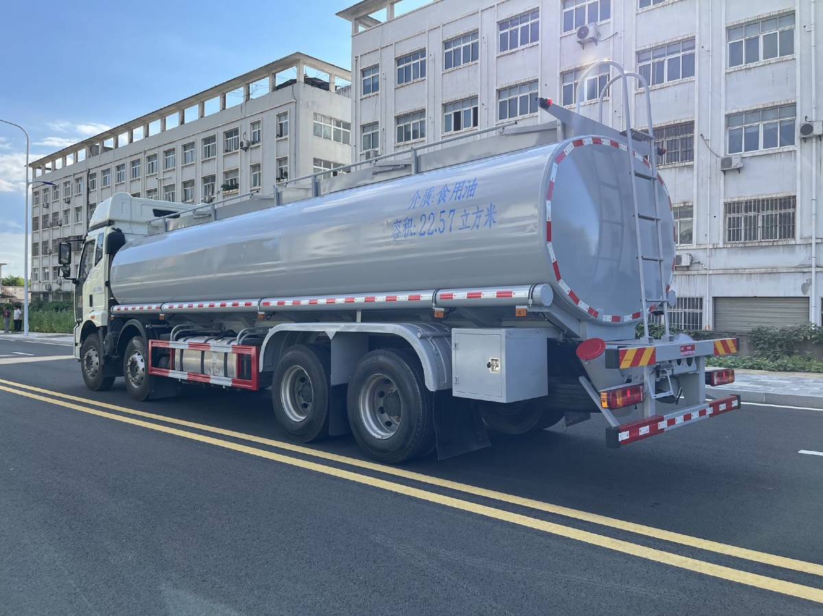 (2)上装配置:严格按照公告外观样式制作,罐体采用5MM厚优质碳钢制作,方圆罐,公告有效容积21.5方,水压封头,带自吸自排80-60泵安装在副驾一侧,副驾一侧三开门工具箱,正驾尾部一个单开门工具箱,新式挡泥板,铁炮筒,4个独立折叠护栏,围边内铺防滑网,后爬梯加粗,两根输油管,带牌照灯座,两个8KG灭火器,其余厂内标配。
