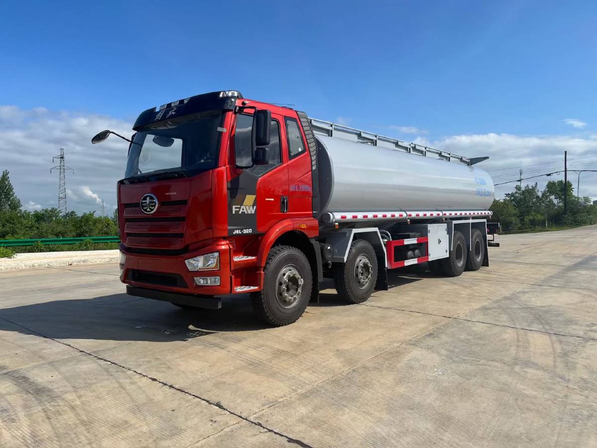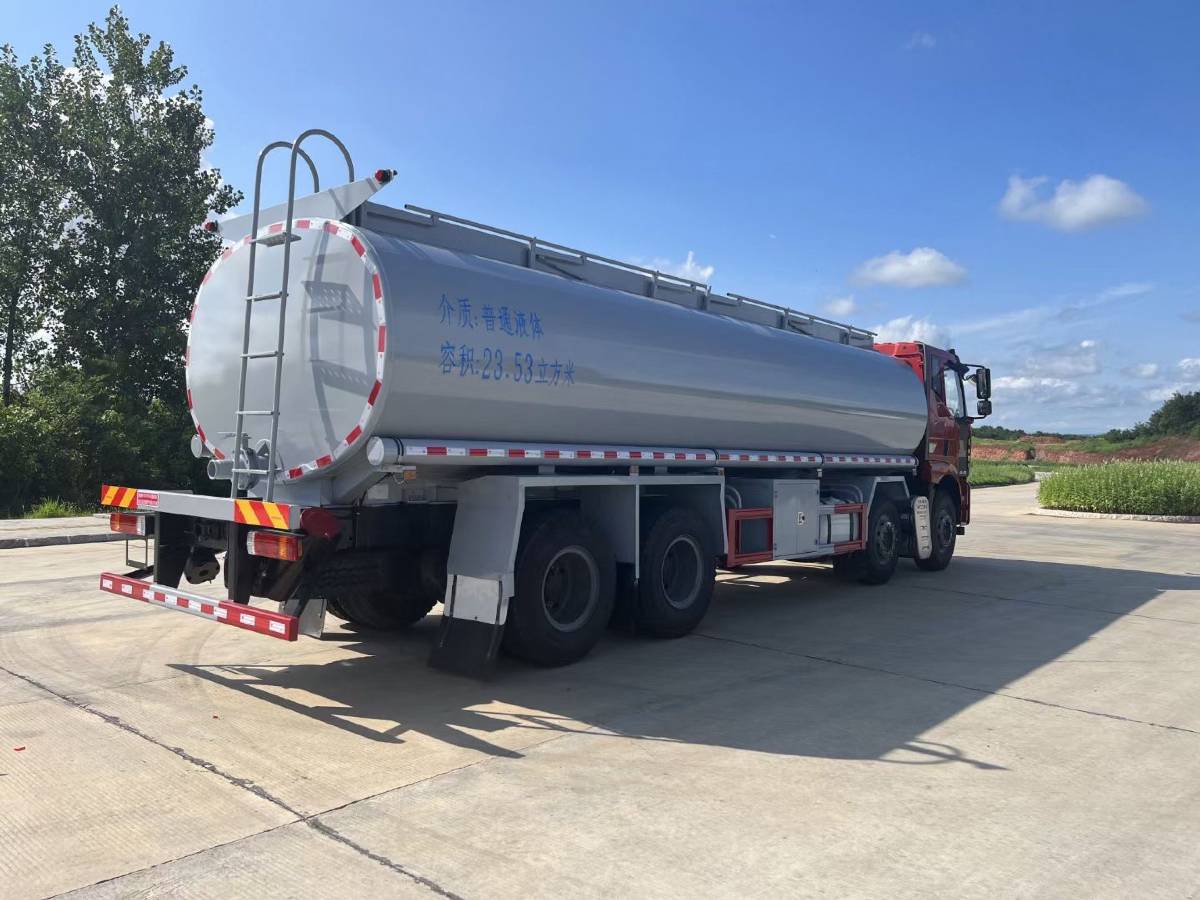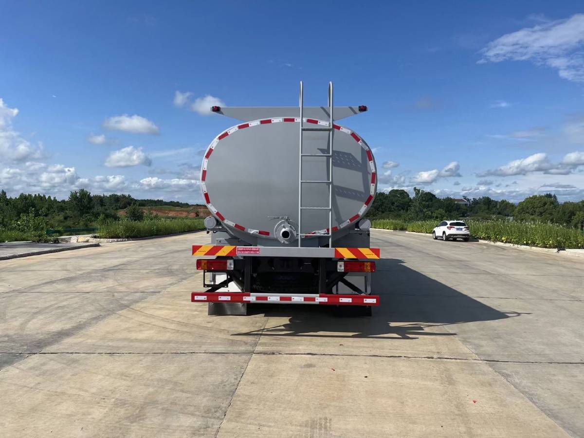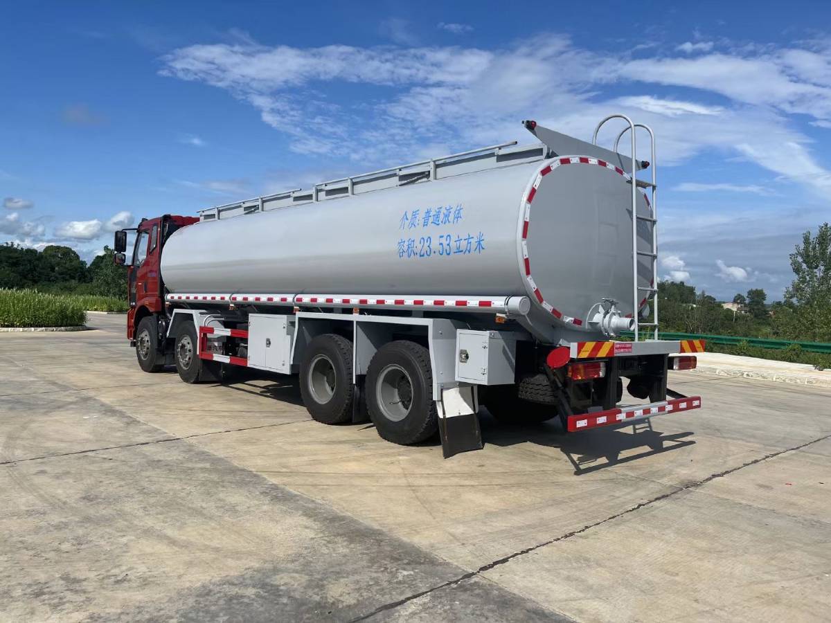 (2)上装配置:罐体厚度采用5mm优质碳钢板制作,方圆罐,罐体容积28.5方,两个普通罐口,独立四个折叠护栏,水压封头,带80-60自吸自排泵,两边双开门工具箱,罐体尾部带一个150变100的蝶阀自流,围边内铺防滑网,新式挡泥板,铁炮筒,后爬梯加粗,两根输油管,带牌照灯座,正驾侧尾部带一个小工具箱,两个八公斤灭火器,其余厂内标配。