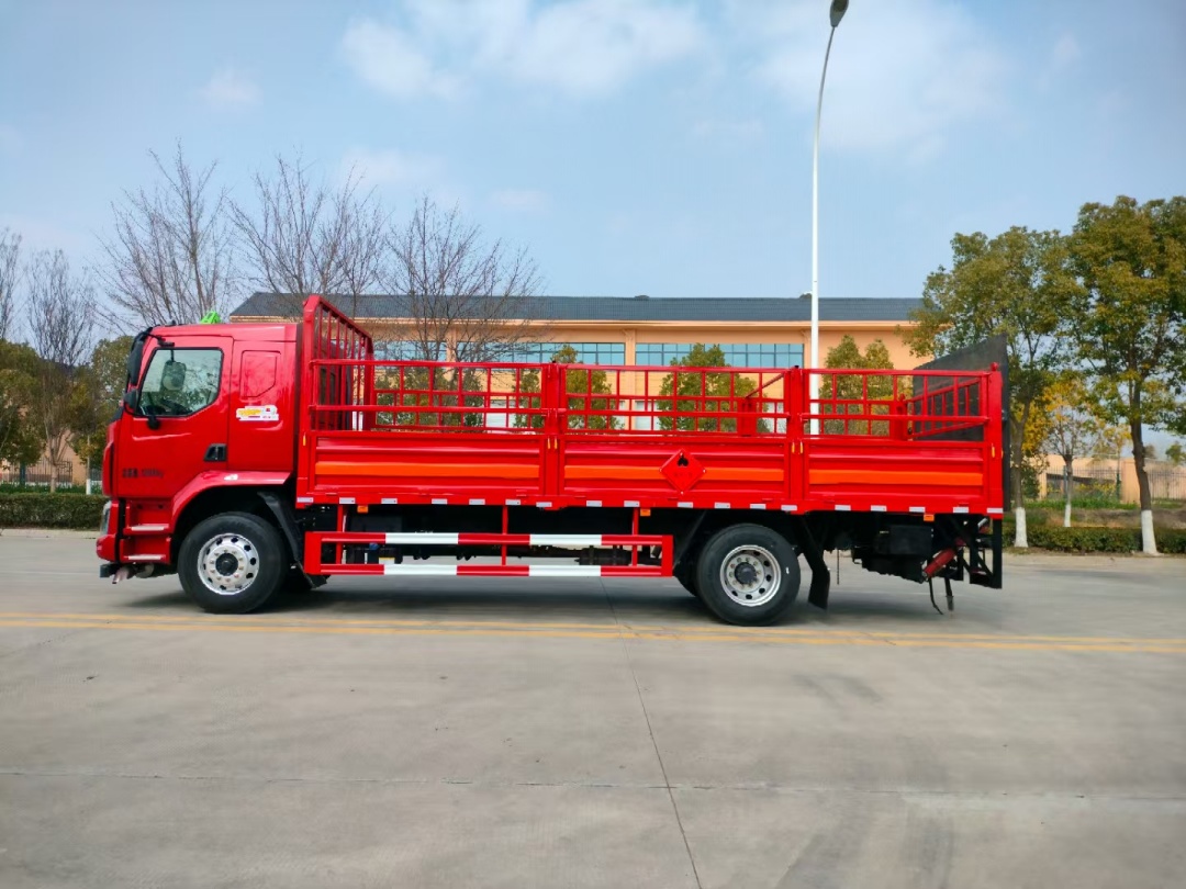 轴距:5100 驾驶室:M3经典款驾驶室 发动机:玉柴220马力发动机 变速箱:法士特8档变速 车架:264(6)车架 前/后桥:前桥3.6T盘式,后桥9T后空悬 轮胎:275/80R22.5 前轮爆胎应急防护装置 仓栏配置:严格按照公告尺寸制作,底板采用5MM花纹板制作,底板上铺静电胶皮,低栏瓦楞式,配备灭火器,静电拖带等,严格按照国家危险品法规进行“易燃气体”标识粘贴等。 选装气瓶带吊机:带徐工吊(4吨3节折臂)