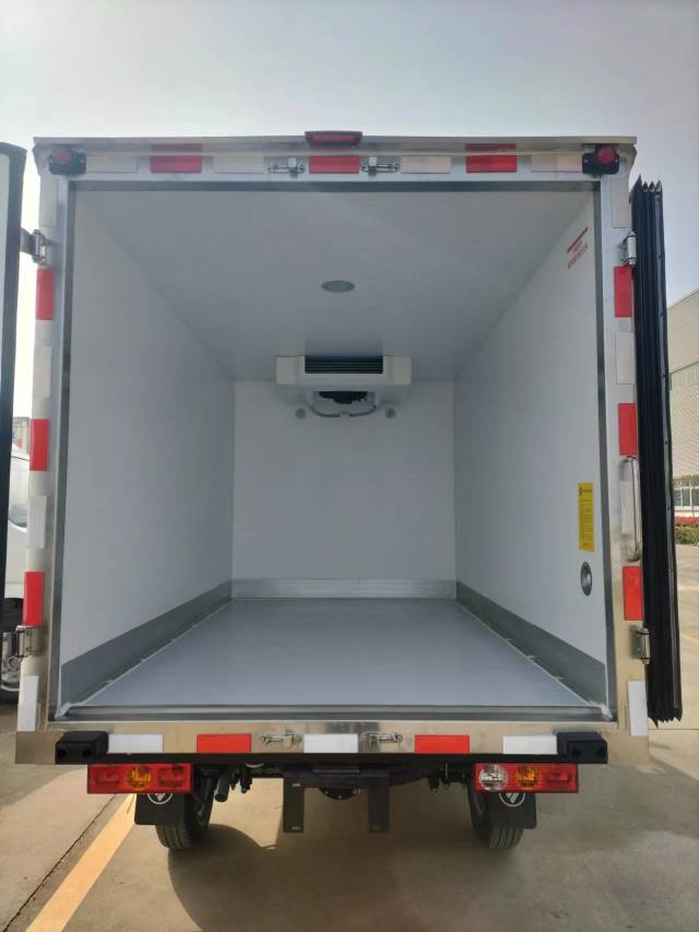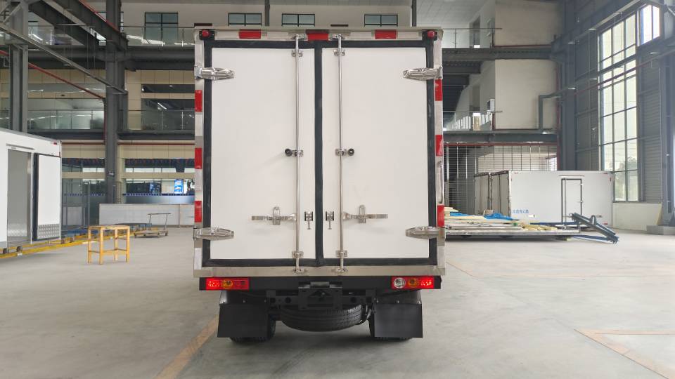 (3)厢体配件:厢体周边铝合金包边,不锈钢包角,不锈钢门锁铰链,不锈钢门框及合页,厢体内节能LED照明灯,副梁护杠做电泳漆。