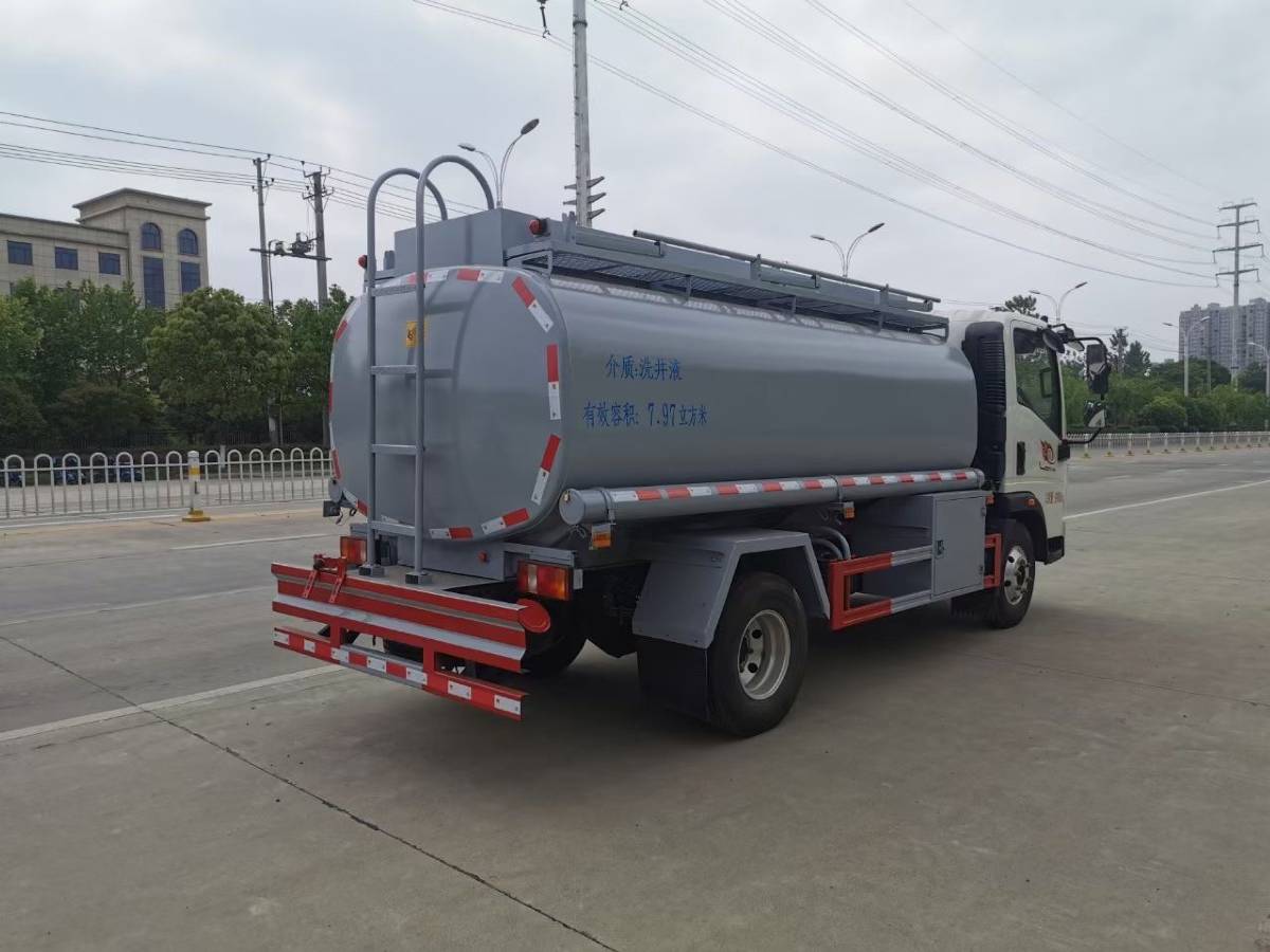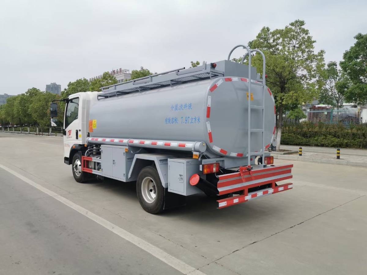 (2)上装配置:严格按照公告尺寸外观样式制作,罐体厚度采用4mm优质碳钢板制作,方圆罐,罐体有效容积7.97立方米,水压封头,带一个欧标罐口,一个海底阀,罐体尾部加装紧急切断阀按钮,带60-30自吸自排泵,泵箱装右边,预留大流量供液设备及15米自动回位卷盘位置在左侧,带一个工具箱,防滑爬梯,网状走道,折叠护栏,两根与罐体等长输油管,两个灭火器,欧式锁,带牌照灯,静电带,铁炮筒,其余厂内标配,油漆:灰色。